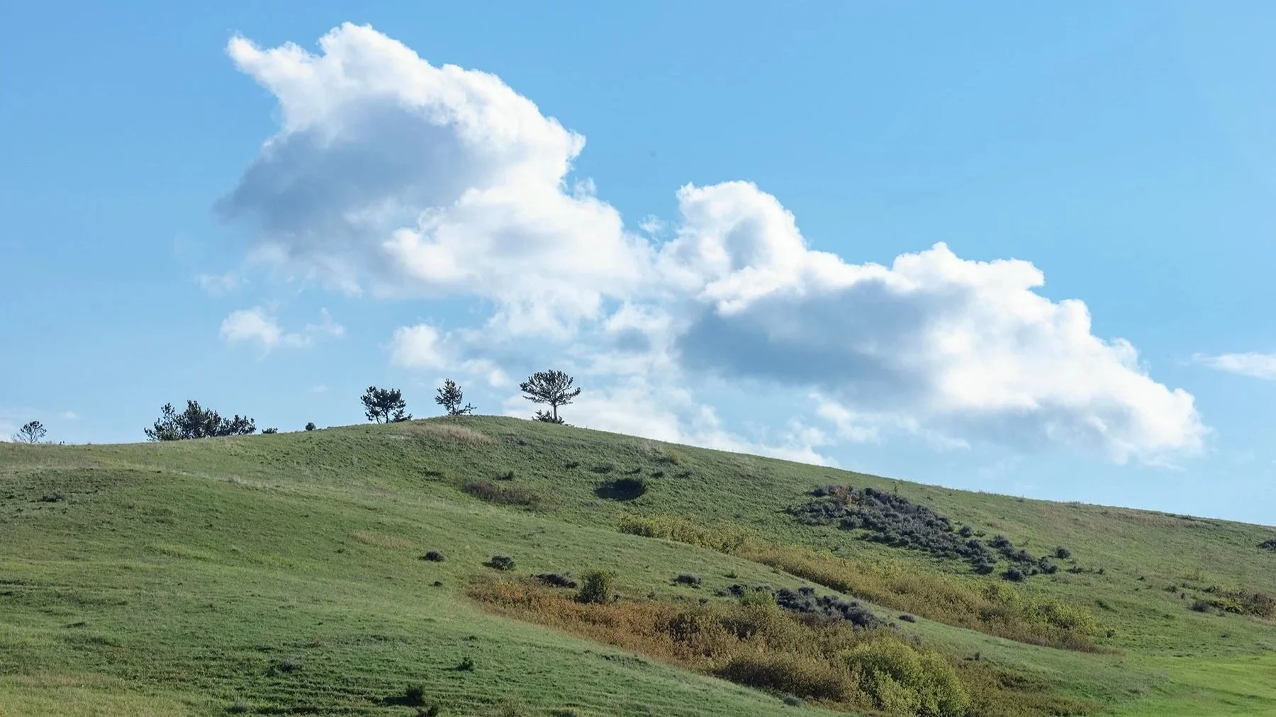 Green hillside with small trees and bushes under a blue sky with scattered white clouds.