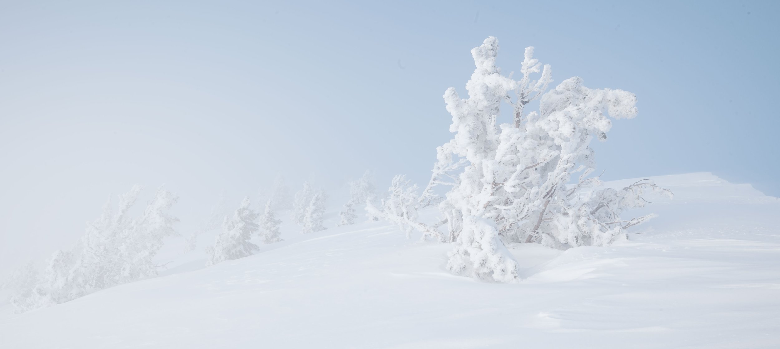 A snow-covered, twisted tree on a snowy mountainside with distant snow-covered trees in foggy weather.